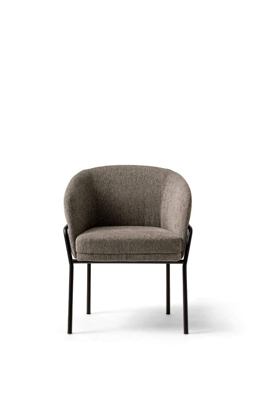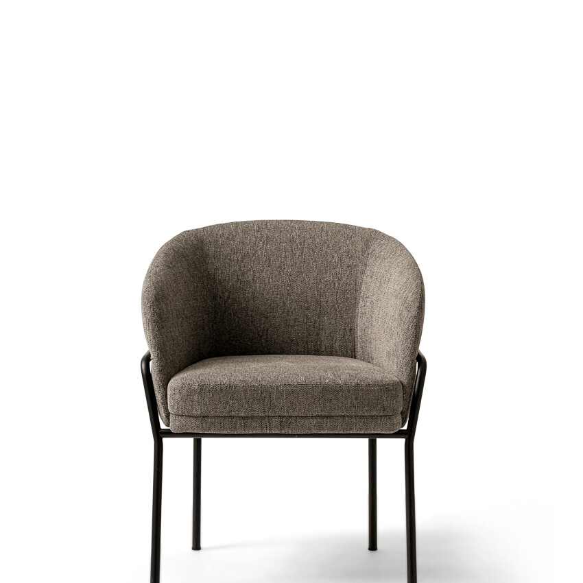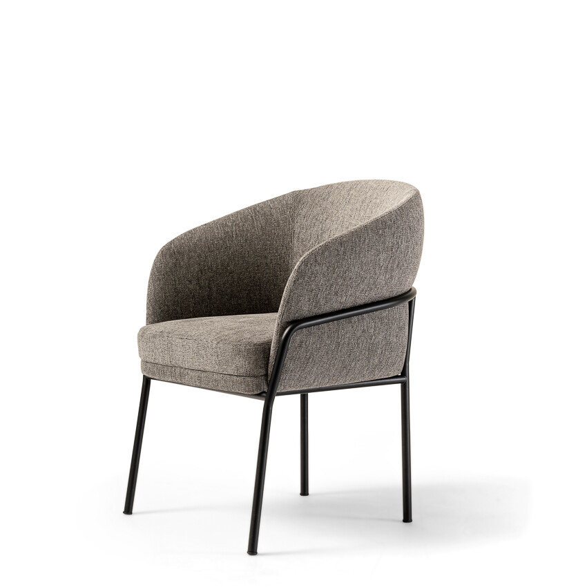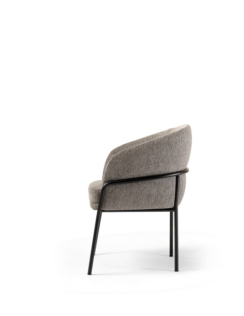 The Avant chair combines elegance, comfort, and style. The chair has a barrel silhouette featuring a unique back. It is offered in fabric, suede, leather, and velvet to complement various colors. The legs of the stool are made of Canaletto walnut wood, which provides an elegant texture of dark flamed and striped veins to contrast its paler shades. The seat structure is wood-padded with multi-density foams to provide long-lasting comfort.