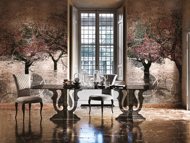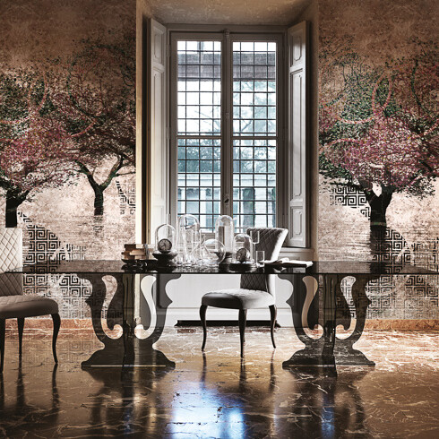 The plays of light typical of jewellery illuminate the walls with shimmering reflections. Imaginary landscapes tickle your fantasy creating dreamy atmospheres and luxury rooms. Pink Gold is the new exclusive gold leaf color option already introduced with the Goldenwall collection 2018.