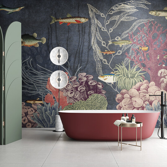 Decorated glass fibre glass for floorings, bathrooms and kitchens. The revolutionary covering with protective and decorative function originates from the cooperation between Inkiostro Bianco and Mapei.