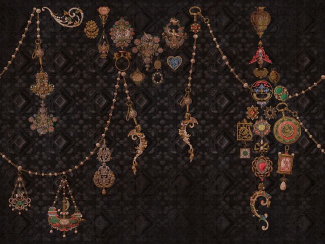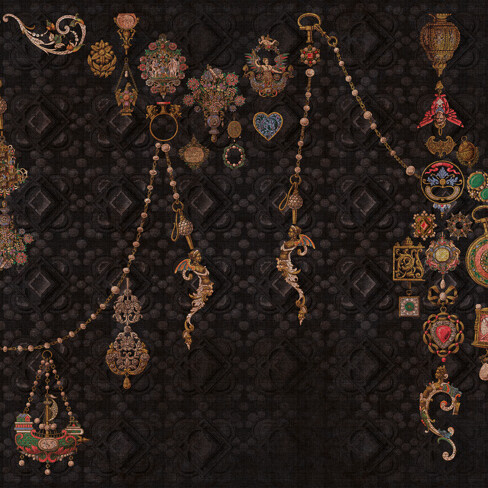 A journey through enchanted gardens, metallic shapes and reminiscences of ancient artistic techniques, where the stylistic language goes from Art Deco, Art Nouveau style, woodcut to brocades, wax print and contemporary illustration.