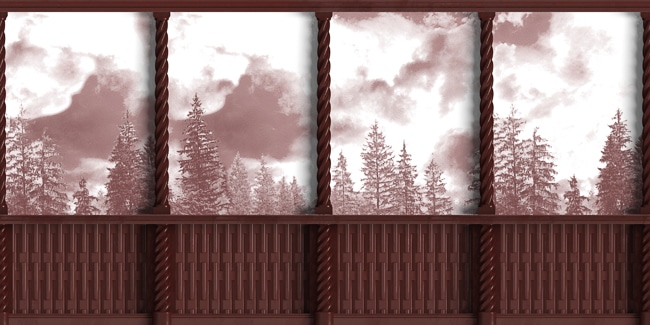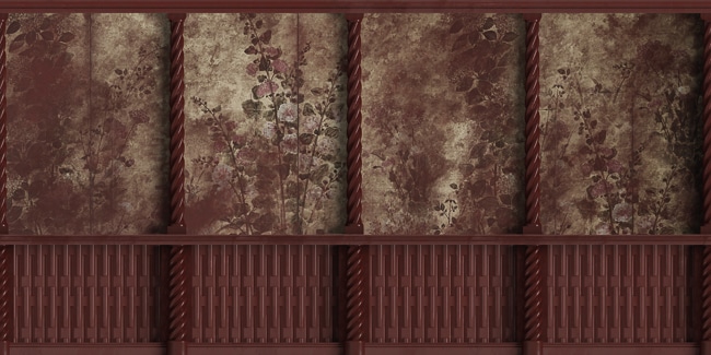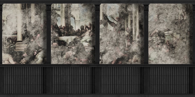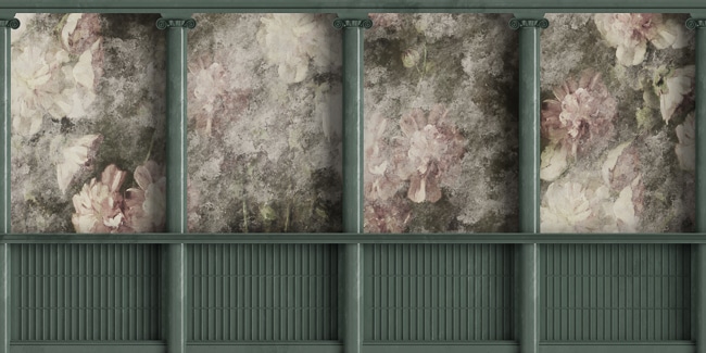 Interiors are reinterpreted. An oxymoron of spaceis created by using three-dimensional elements to recreate two-dimensional ones. Volumes and perspectives, porches and facades are reshaped to fit the surface of the wallpaper.