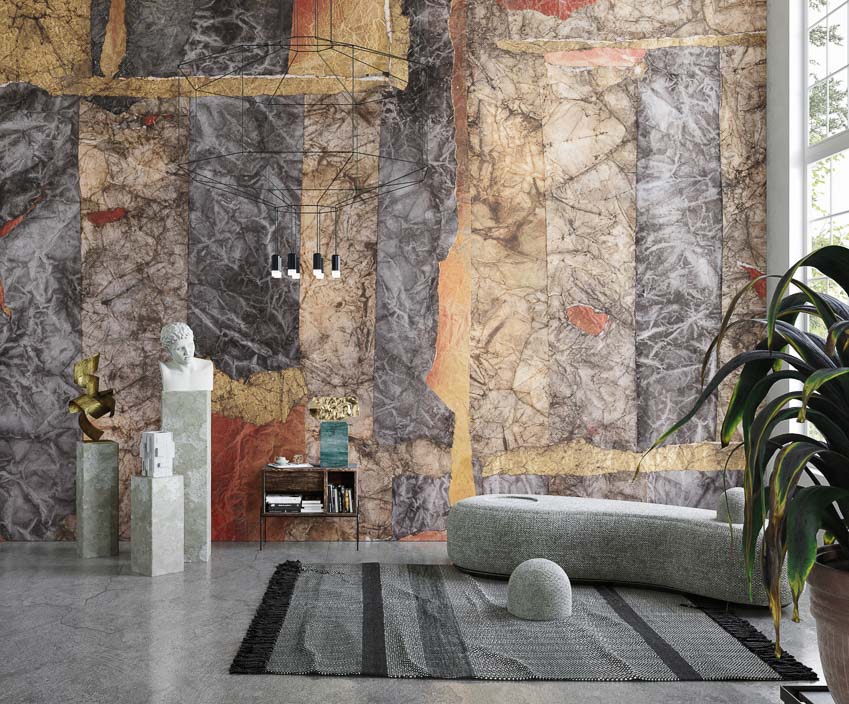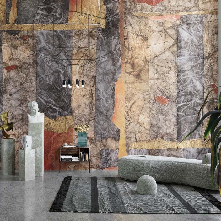 Decorated glass fibre glass for floorings, bathrooms and kitchens. The revolutionary covering with protective and decorative function originates from the cooperation between Inkiostro Bianco and Mapei.