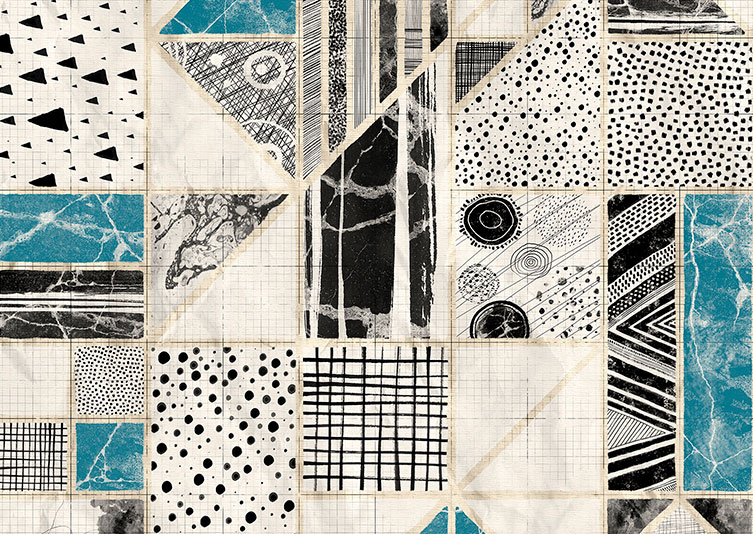 Decorated glass fibre glass for floorings, bathrooms and kitchens. The revolutionary covering with protective and decorative function originates from the cooperation between Inkiostro Bianco and Mapei.