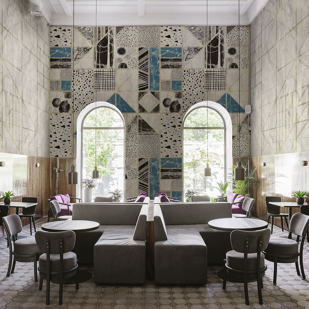 The collection Undressing Surfaces has been conceived for decorations on multiple surfaces (walls, floor, ceiling). Each graphic variation shows different elements overlapping, that allow a creative room makeover. This philosophy allows the use of this collection for large-scale projects, combining the graphic designs depending on the project.