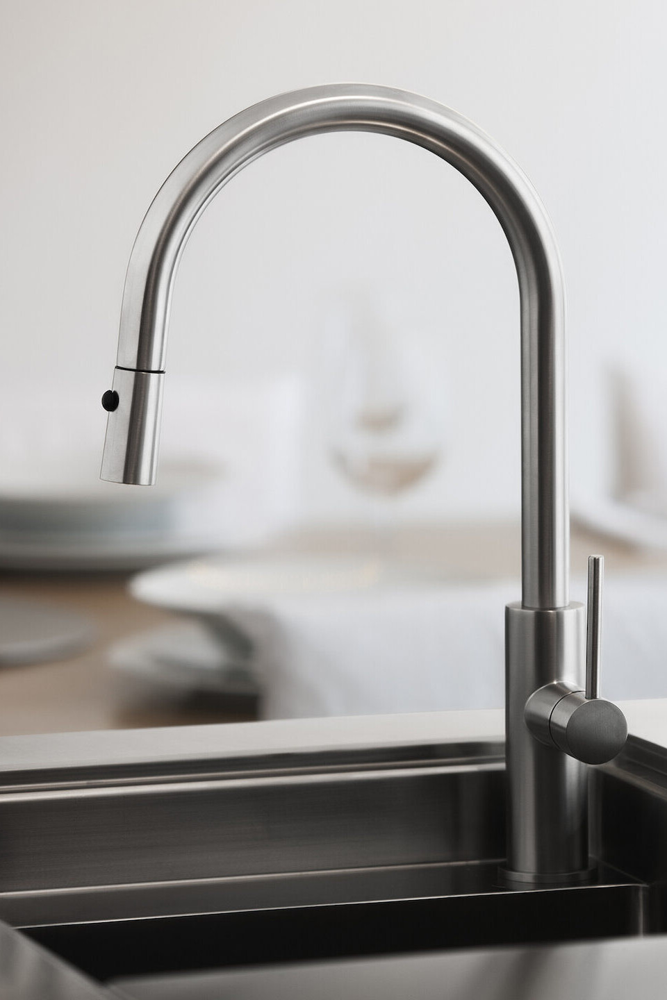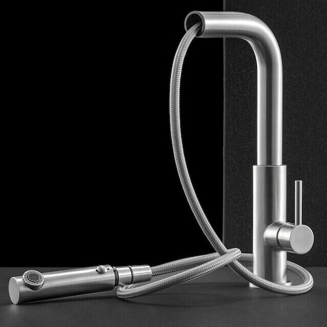 The ACCIAIO collection draws inspiration from a linear aesthetics and an innovative technology, blending together just like in a professional kitchen. The clean and modern form, elegant in its sobriety, is nothing but the mirror of a all-round technological product, consisting of pull-out hand shower, moving spring and complete rotation, which guarantee the best procedures in an elegant and sophisticated environment, where the form becomes an emblem for high professionalism and efficiency.